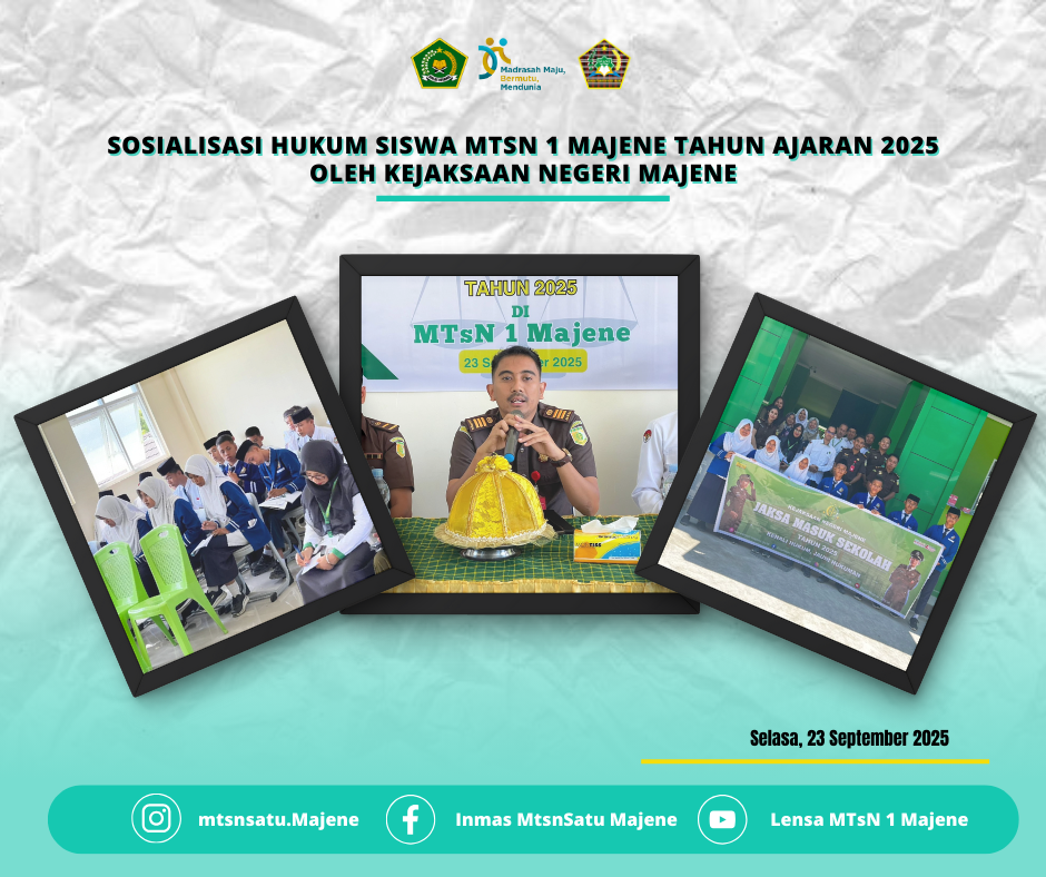 INMAS – MTsN 1 Majene mengadakan sosialisasi hukum dengan tema “Kenali Hukum, Jauhi Hukuman” dalam program “Jaksa Masuk Sekolah” pada hari ini, Selasa, 23 September 2025. Acara ini merupakan kerja sama antara pihak madrasah dan Kejaksaan Negeri Majene, yang diikuti oleh 40 peserta didik serta guru dan staf.