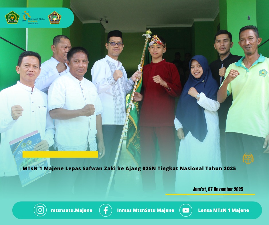 INMAS – Rasa bangga dan haru menyelimuti keluarga besar MTsN 1 Majene saat melepas Safwan Zaki, murid berprestasi yang akan berlaga di Olimpiade Olahraga Siswa Nasional (O2SN) tingkat nasional cabang olahraga Pencak Silat mewakili Provinsi Sulawesi Barat. Kegiatan pelepasan berlangsung sederhana namun penuh makna di madrasah. Guru dan staf turut hadir memberikan doa serta dukungan agar Zaki mampu menunjukkan kemampuan terbaiknya di ajang bergengsi tersebut.