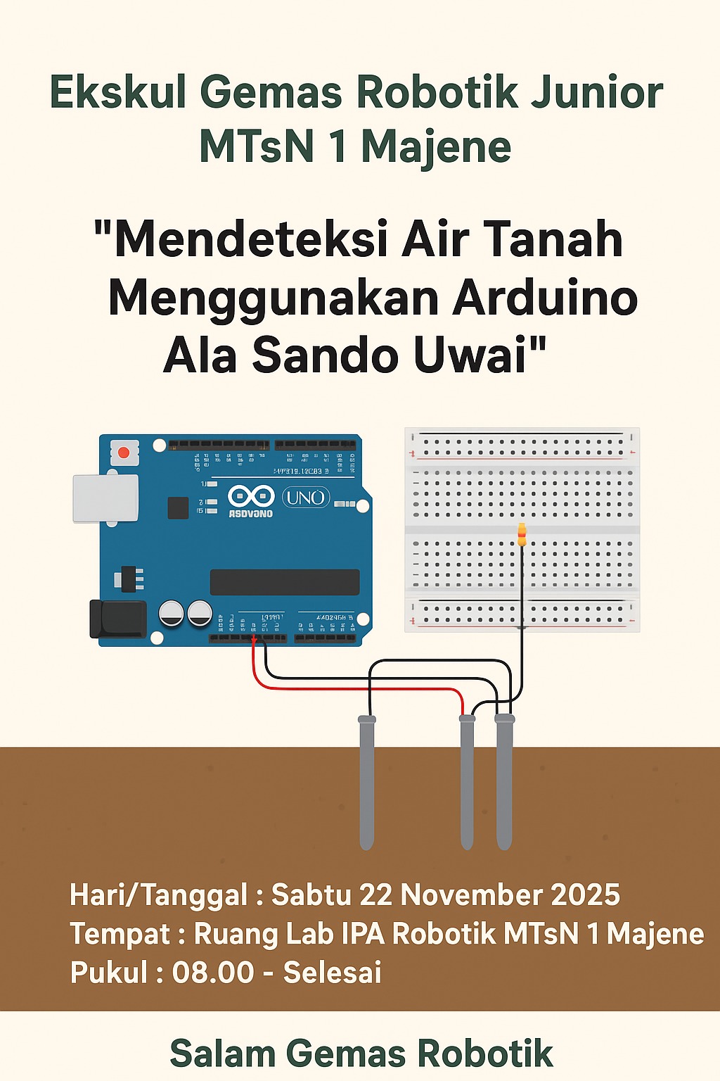 Kegiatan ini diselenggarakan mulai pukul 08.00 hingga selesai di Ruang Lab IPA Robo  tik MTsN 1 Majene. Proyek ini bertujuan untuk memperkenalkan konsep dasar elektronika dan pemrograman mikrokontroler Arduino UNO dalam aplikasi yang relevan dengan lingkungan, khususnya dalam mendeteksi keberadaan air tanah.
