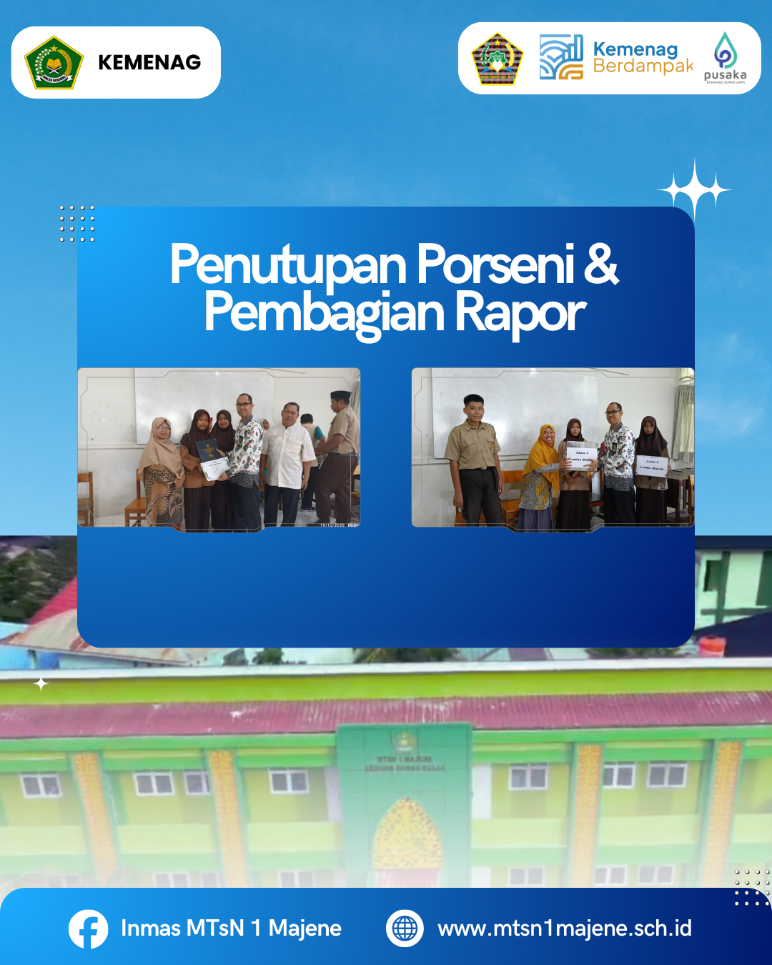 Majene, 19 Desember 2025 – Suasana penuh antusiasme mewarnai lingkungan MTsN 1 Majene pada Jumat pagi ini. Madrasah secara resmi menggelar acara penutupan rangkaian kegiatan semester ganjil tahun ajaran 2025/2026 yang ditandai dengan dua agenda utama: penyerahan laporan hasil belajar (Rapor) serta pengumuman pemenang Pekan Olahraga dan Seni (Porseni).