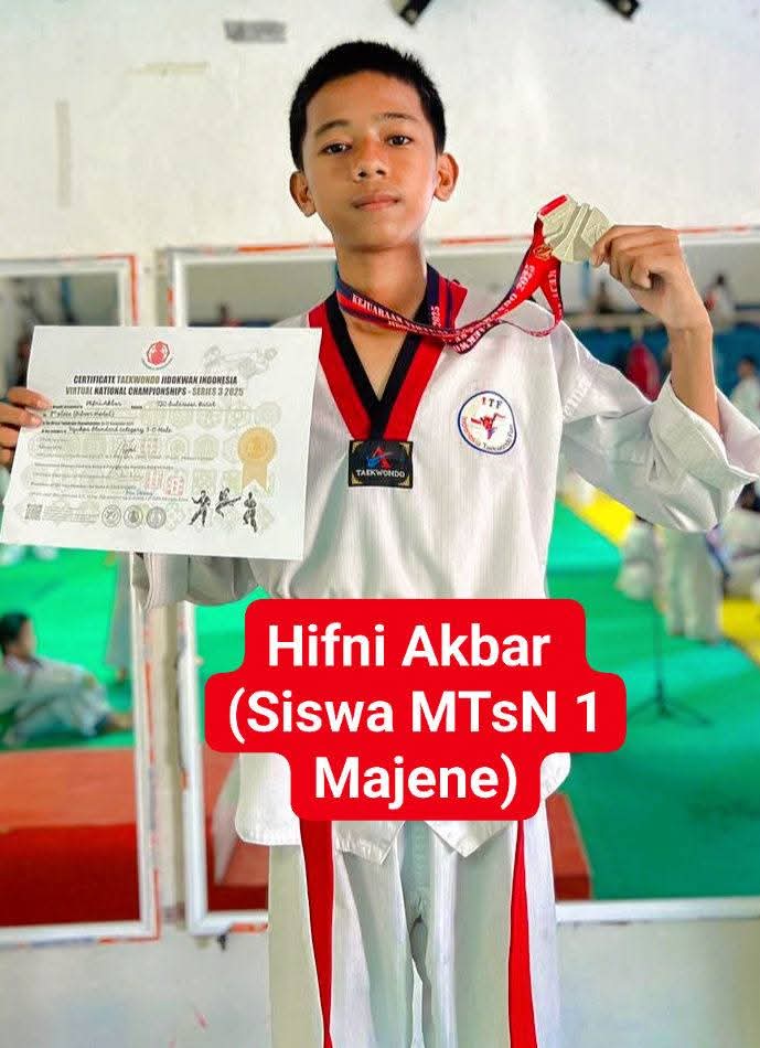 Majene 22 December 2025 — Prestasi membanggakan kembali ditorehkan oleh siswa MTsN 1 Majene. Salah satu siswa terbaik, Hifni Akbar, berhasil meraih Medali Perak pada ajang Kejuaraan Nasional (Kejurnas) Taekwondo Jidokwan Indonesia yang diselenggarakan secara virtual.