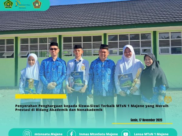 Selamat datang di MTsN 1 Majene - Madrasah berprestasi dengan akreditasi A (Unggul) - Mengutamakan pendidikan akademik, karakter, dan keagamaan.